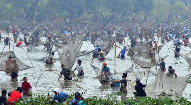 Vendasit kishin mbushur dje bregun e liqenit me rrjetat tradicionale Assameze duke performuar traditën e vjetër të peshkimit komunitar.