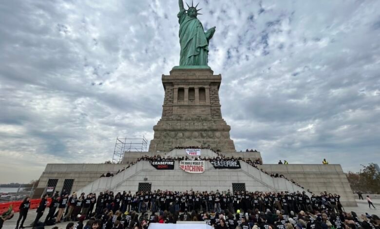 Rreth 500 protestues, kryesisht anëtarë të grupit Zëri Hebre për Paqe, u mblodhën dje në Statujën e Lirisë në Nju Jork, duke kërkuar një armëpushim në Rripin e Gazës, ku më shumë se 10.000 njerëz, përfshirë rreth 4.000 fëmijë, kanë vdekur në muajin e kaluar.