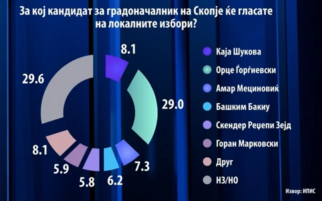 Në panoramën e përgjithshme të garës, Orce Gjorgjievski prin me 29%, ndërsa 29.6% e votuesve mbeten ende të pavendosur. Kaja Shukova ka 8.1% dhe Goran Markovski 5.9%, duke plotësuar renditjen.