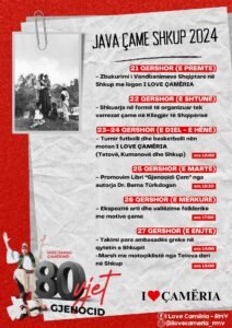Shoqata kulturore “Vizioni-M” me moton “I love Çamëria” do të organizojë jubileun e 80 vjetorit të gjenocidit ndaj popullit çam. Ngjarjet të parapara në programin e javës, do të fillojnë që nga sot, e deri më 27 qershor të këtij muaji, njofton Portalb.mk.