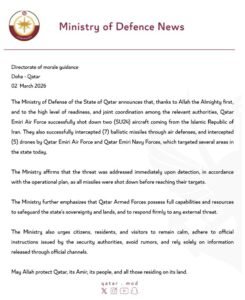 “Janë interceptuar me sukses shtatë raketa balistike përmes sistemeve të mbrojtjes ajrore, si dhe pesë dronë nga Forcat Ajrore dhe Marina e Katarit, të cilët sot kishin në shënjestër disa zona të shtetit”, shton ministria.