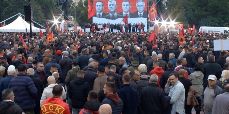 Mijëra protestues nga të gjitha trojet kombëtare, shumë prej tyre të ardhur nga Kosova me flamuj kuqezi dhe flamuj të UÇK-së, janë mbledhur në shesh për të shprehur solidaritetin e tyre.