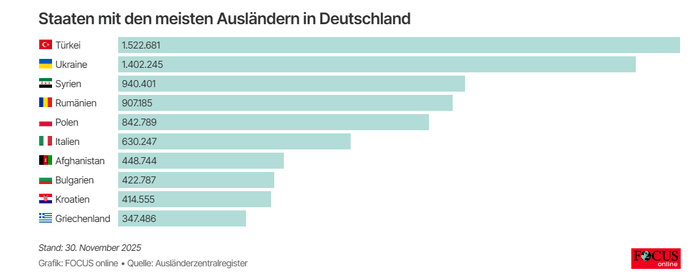Turqit mbeten në krye të listës, me rreth 1.52 milion banorë, por dominimi i tyre është nën kërcënim. Për shkak të luftës në shkurt 2022, numri i ukrainasve në Gjermani është rritur në mënyrë dramatike dhe tani tejkalon 1.4 milion, duke i bërë ata grupin e dytë më të madh të të huajve. Për krahasim, në fund të vitit 2020, vetëm rreth 135 mijë ukrainas jetonin në Gjermani.