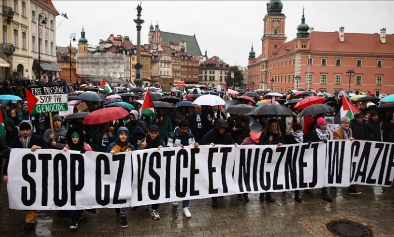 Qindra demonstrues u mblodhën të dielën në sheshin e qytetit të vjetër në kryeqytetin polak Varshavë në solidaritet me popullin palestinez dhe për të dënuar sulmet izraelite në Gaza, raporton Anadolu.