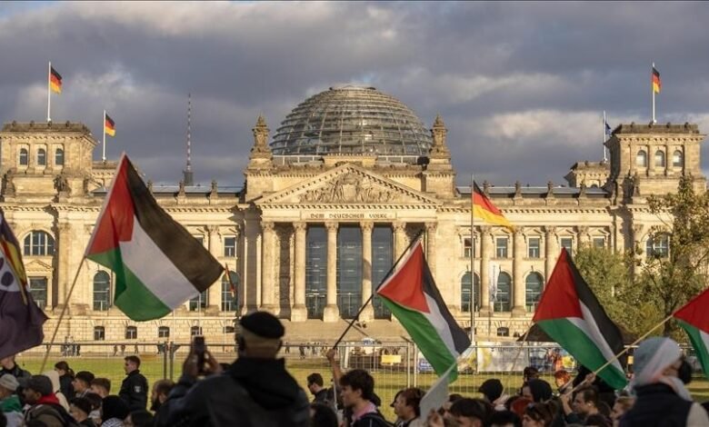 Duke mbajtur flamuj palestinezë, protestuesit brohoritën slogane si: “Izraeli terrorist” dhe “Liri për Palestinën”. Protestuesit gjithashtu kritikuan qeverinë gjermane për mbështetjen e saj ndaj Izraelit.