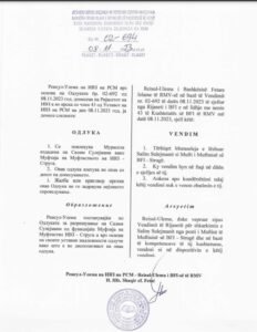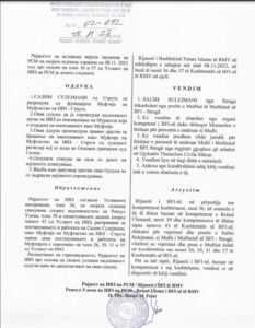 “Gjatë kësaj mbledhje Rijaseti diskutoi për gjendjen aktuale në Muftininë e Tetovës dhe Muftininë e Strugës, ndaj të cilëve u soll vendim unanim nga Rijaseti i BFI-së, për shkarkimin nga detyra e Muftiut të Muftinisë së Tetovës, Qani Nesimi dhe në vend të tij për ushtrues detyre deri në zgjedhje të reja të Muftinisë së Tetovës u emërua Ushtrues Detyre Mufti dr. Selver Xhemaili. Po ashtu nga detyra u shkarkua edhe Muftiu i Muftinisë së Strugës, Salim Sulejmani, në vend të të cilit u emërua Ushtrues Detyre Mufti i Muftinisë së Strugës Mr. Jusuf Ismaili, deri në zgjedhje të reja.