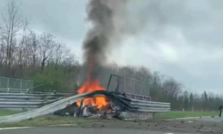 Vetura u copëtua, copat u shpërndanë dhe flakë e madhe u pa. Mediat italiane shkruajnë se Ferrari GT C4 i bardhë kishte qenë duke lëvizur me mbi 200 km/h kur ka rrëshqitur në rrugën e lagësht dhe është përplasur në anësore.